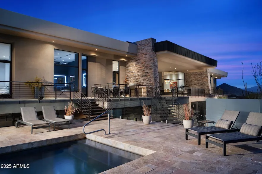 Exquisite Contemporary Built by Sever Design Group situated on 1.75 elevated acres overlooking the 13th green & 14th fairways of the Troon North Pinnacle course w/panoramic views of Pinnacle Peak, Mtns, & city lights. Elegant & casual lifestyle w/exquisite finishes & attention to detail. ELEVATOR from garage to the Main Living Areas with two primary suites all on 1 level. The home includes a total of 5 BR, 5.5 Baths, office, crafts, fitness, den, & formal dining. Chefs Kitchen w/top of the line appliances gas cook top, dbl ovens, two dishwashers, 36'' side by side fridge. The kitchen opens to the great room w/stoneaccents, fireplace and wet bar. Includes Lutron lighting, motorized shades, & Bamboo floors. expansive outdoor living in front & back, BBQ, heated pool & spa, and 4 car garage