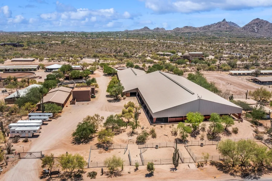 Set on 15 acres, this premier equestrian training and boarding facility has been thoughtfully updated to meet the highest standards. Highlights include a 34-stall main barn with an expansive 120x240 attached covered arena, a 13-stall junior barn, a 16-stall mare motel, and 3 custom horse casitas. The property also features a 150x300 outdoor arena, 15 turnouts, a round pen, 6-horse hot walker, air-conditioned lounge, vet lab, and multiple tack rooms. Accommodations include a luxurious, redesigned 2-bed/2.5-bath guest house with custom Italian finishes, a barn office/guest house with a backyard & rooftop deck, and a staff duplex with two 2-bed/1-bath units. Easy access to trails & stunning views of Pinnacle Peak, this property offers both exceptional facilities and a prime location.