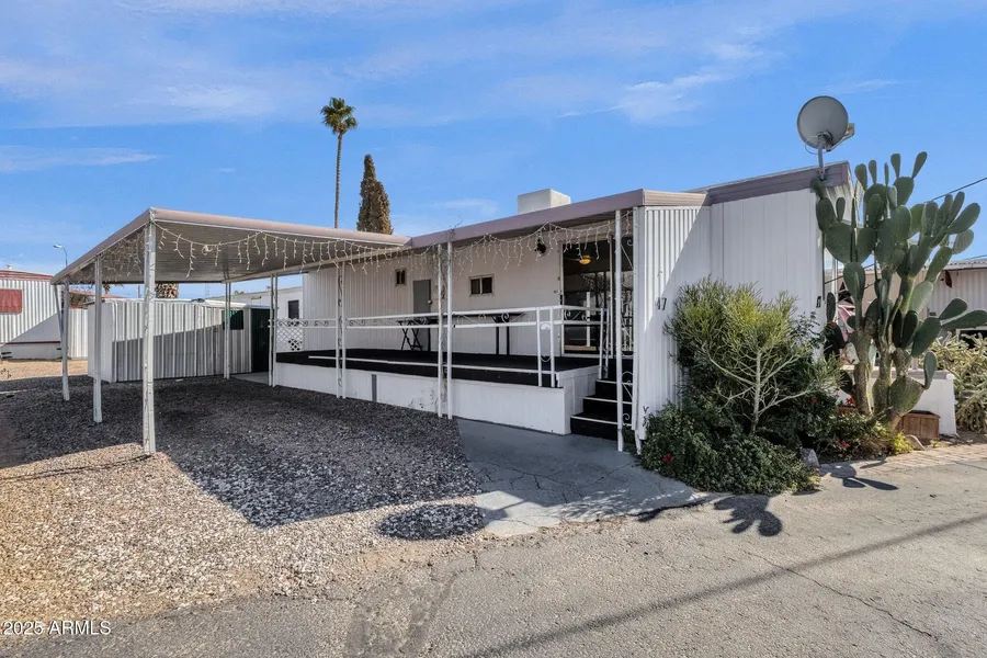 Welcome to this charming 1-bedroom, 1-bath mobile home in the desirable 55+ community in Mesa. With 528 sq. ft. of well-designed living space, this cozy home offers a perfect blend of comfort and functionality. As you approach the property, you'll be greeted by a quaint front porch, an ideal spot to relax and enjoy the Arizona weather. The front and back yards feature low-maintenance gravel and stone landscaping, adding to the home's curb appeal and making outdoor upkeep a breeze. Stepping inside, you're greeted by a cozy living area that is perfect for relaxing or entertaining guests. The open layout makes the most of the space, offering a bright and welcoming atmosphere. The kitchen is efficient and well-appointed, with plenty of cabinet storage to keep your kitchen essentials organized organized. It's a great space for preparing meals, with everything you need right at your fingertips. The bedroom is a peaceful retreat, featuring built-in cabinets and a mirror that adds a touch of elegance and functionality. This room provides a comfortable and inviting space to unwind after a long day. The bathroom is just as impressive, featuring a 3/4 bathroom that offers both style and convenience with sleek finishes and thoughtful details. Step outside into the backyard where you'll find the same gravel and stone landscaping, providing a clean, low-maintenance outdoor space to enjoy. Whether you're looking to relax in the sun or create your own small garden oasis, this area offers plenty of possibilities. The community here is fantastic, offering residents access to a variety of amenities including a refreshing pool, spa, and pickleball courts for outdoor fun. The clubhouse is a great spot to socialize with neighbors, and the convenient on-site laundry facilities make chores a breeze. This home is the perfect opportunity to enjoy a comfortable lifestyle in a welcoming, active community.