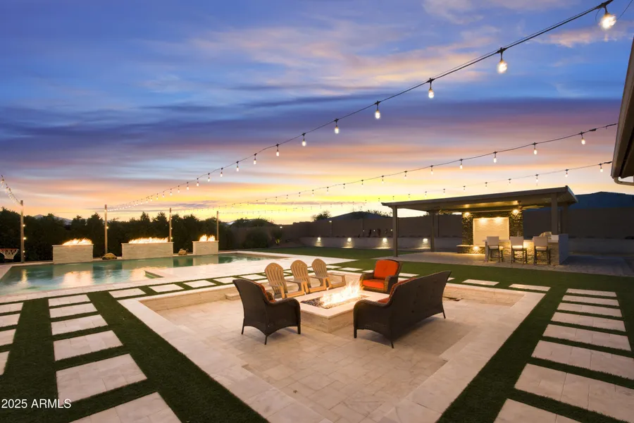 Stunning 4,886 sq ft estate (4,006 sq ft main home + 880 sq ft detached casita) on nearly an acre features a guest/multi-gen suite with private entrance, kitchenette, bedroom, and living area. The main home offers 5 bedrooms, a Jack-and-Jill bath, and a spacious primary suite with outdoor access and a walk-in closet connected to the laundry room. Enjoy a gourmet kitchen that flows into bright, open living spaces with premium finishes. The resort-style backyard is built to entertain with a custom pool, sunken fire lounge, and lush landscaping. The detached casita includes a bedroom, kitchenette, full bath, and half bath with outdoor access. Move-in ready luxury!