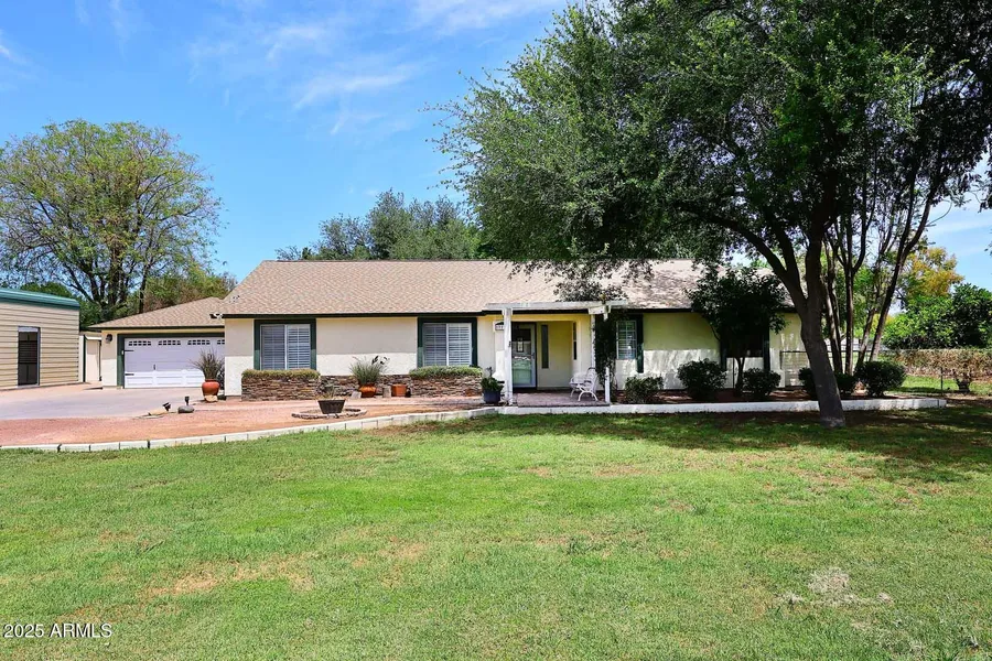 Welcome to a legacy home on Brooks Farm Rd - where generations thrive in the heart of Gilbert. Enjoy over an acre of irrigated land with lush grass, fruit trees & room to grow. Inside: vaulted ceilings, electric fireplace, granite counters, SS appliances, walk-in pantry and a custom primary closet. Single story split floorplan w/3 bed/2 bath in main house. Updates include: A/C (2025), vinyl plank flooring, int/ext paint, water softener (2024). Attached 635 SF guest ste w/bed, bath, kitchenette & great room. RV carport w/50 AMP & sewer dump, 30x25 insulated finished climate controlled workshop, garden, shed, paver patio, auto sprinklers, putting green & more. N/S exposure and a true Gilbert gem!