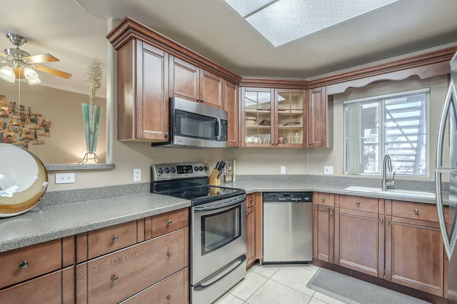 Luxurious ground-level 3-bed, 2-bath condo in the sought-after Portofino community of Ahwatukee. This impeccably maintained home offers tile flooring throughout, an upgraded kitchen with stainless steel appliances, and a spacious layout. The elegant primary suite and generous secondary bedrooms provide comfort for guests, a home office, or personal retreat. Enjoy inside laundry, assigned covered parking, and resort-style amenities. Ideally located near top dining, shopping, parks, schools, and with quick access to I-10 and 202 freeways.