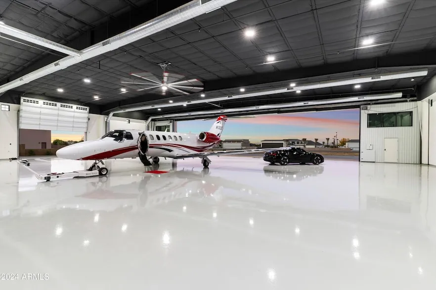 Introducing Mision Veintidos (Mission Twenty-two). This amazing Pegasus Airpark(5AZ3), Queen Creek, AZ home was inspired by classic Spanish style missionarchitecture. The unique mission style entrance to the home is through a breezewaygate which leads you to a stunning courtyard view of the estate. This estate of 32,000sq ft of luxury living, with an incredible 26,000+ sq ft of conditioned space has 16'' thickwalls for style and maximum efficiency. Perfectly situated on North South double lot,taking a massive 350' of taxiway, sits the main residence on three levels and includesall these features: A 10,000 sq ft steel construction Hangar with Full HVAC, Epoxy coated floor, ''Big Ass''Fan, Pocket style main hangar doors with an 78'x17' clear opening. Flight office, Storage room, Downstairs bathroom, Interior stairs to mezzanine with bar, Upstairs bathroom, Balcony, Two motorized vertical opening 20 ft glass garage style doors facing the courtyard. " A massive courtyard featuring: 2,000 feet of covered breezeways, Multiple swimming pools with fountains and firepots, Covered outdoor full kitchen under a mission style bell tower, Lit Pickle ball/basketball sports court & Putting green, Sand Volleyball court. "The main house has a 5,000 sq ft Basement: bowling alley, 75 ft shooting range, Tiger Woods' (Full Swing Pro 2.0) Golf Simulator, Wine Cellar, Walk-in vault, Storage room, Bathroom, Interior and exterior stairs. " Next is a 2000+ sq ft detached Master Bedroom: Custom his and her walk-in closets, Separate bathrooms and linens, Large walk-in shower & separate tub, Incredible ceiling details with accent lighting, Multiple balconies, Bar, Fireplace, sliding doors. " Master Spanish Garden: with water and fire features. " General Design considerations: 16" double insulated walls which are quieter, more energy efficient and style correct as seen in the deep-set windows and doors, The extensive iron work is amazing, Custom railing with HH monogram, windows with iron details. " Don't miss these details: clear view elevator from basement to second story sized for wheelchair access. " Wired Cameras access from internet. " Automated lighting. " Security System " Hidden AV closet " Luxury full-service guest suites with spa like bathrooms, suites include laundry and bar in each " 2834 sq ft 2nd Story with Gym, spa and sauna, gym bathrooms & laundry. " Large outdoor balcony, firepit, incredible views of the Superstition and San Tan mountains " Balcony sliding windows overlooking the courtyard. " Firepole slide down from gym to first floor hidden door " Formal living room " 30' sliding glass doors with view of hangar " 28' ceiling with massive beams " Oversize castle style fireplace " Gourmet kitchen with Baking center " Sub Zero Wolf appliances, Easy access from vehicle to kitchen, Fully equipped Butler's Pantry. Dark and smokey (informal sitting room) " Floor level gas fireplace " Full bar " Bathroom " Large sliding window overlooking courtyard pool. Too many features to list.