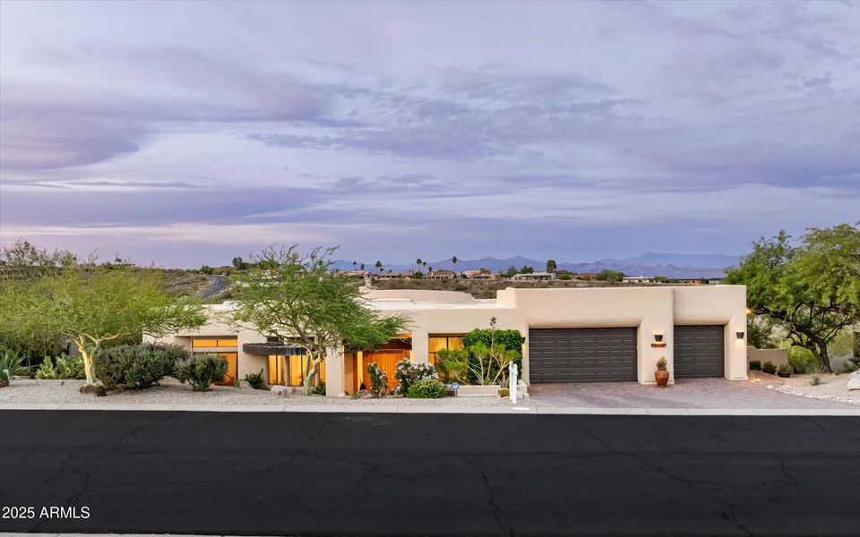 This distinctive Southwest Contemporary home is a one-of-a-kind creation by internationally renowned, award-winning architect Nathan LeBlang. With world-class craftsmanship framed by lush desert landscaping, this home blends easily into its natural desert surroundings. Set on a gently sloping hillside acre in the McDowell Mountain foothills, this architectural gem's smooth sculpted stucco walls, copper and wrought iron accents blend old world design with modern elegance. The resort-style backyard features multiple zones for relaxing and entertaining, with pool, spa, shaded pergola and decks, and newly installed pavers at driveway, walkways and steps. The forever, unobstructed views of Four Peaks and eastern mountain ranges create a backdrop for glorious sunrises, sunsets, and glittering city lights against dark skies. The grand double-door entry opens to sunlit rooms with floor-to-ceiling windows with exterior motorized, remote-controlled sunshades. World class craftsmanship is apparent in elegant architectural details - archways, rounded walls, circular framed ceilings, buttresses, and 5.5" baseboards throughout. The round gathering room is both creative in design yet comfortable with 3 modern synchronized ceiling fans, a woodburning fireplace, underscored by Emperador marble and travertine tile. Timeless, luxury finishes complement traditional to contemporary design aesthetics. The kitchen overlooks the gathering room and is appointed with newer stainless steel Sub-Zero and Wolf appliances including an energy efficient induction cooktop with downdraft vent, timeless clear alder cabinetry with double-sided glass doors and plentiful storage. Enjoy breakfast in the nook with an awe-inspiring Four Peaks sunrise. The spacious master suite's focal point the view, with floor-to-ceiling windows and motorized sunshades, sitting area, and luxurious bathroom with jetted soaker tub, large shower with granite slab surround, dual sinks plus a tucked-away makeup vanity. The closet's built-in dresser drawers will be coveted! The 2 additional bedrooms, study and den are separated, and each bathroom has a water closet for further privacy. The unique floor plan offers an open den plus a study. Both could be converted to bedrooms, while the extra-large powder room with water closet offers space to add a shower, converting it to a full bath. LeBlang designed the home to flow naturally with the terrain, using minimal steps where needed in a design maximizing light, privacy, and livability. The $250,000+ investment in the property includes cosmetic enhancements, upgraded interior and exterior components, plus an extensive landscape and hardscape redesign, full backyard and pool renovations, roof replacement, and 2 newer Trane HVACs with complete duct sealing for energy efficiency. (See Improvements List for details.) Golden Eagle Estates is surrounded by protected NAOS land, ensuring your views remain unobstructed forever. Nearby, the Golden Eagle Trailhead offers access to scenic, groomed hiking and biking trails in the McDowell Mountain Preserve between Fountain Hills and Scottsdale. Fountain Hills, a small town with natural beauty and artistic charm, is known for its custom homes surrounded by breathtaking, forever views, natural desert landscape, an upscale lifestyle, outdoor recreation and its iconic fountain. Residents enjoy a vibrant arts scene, fine dining, boutique shopping, healthcare facilities, top-rated golf at 4 public and 1 private course, and a slower, more relaxed pace, conveniently close to large city amenities. The town is a certified International Dark Sky Community, offering incredible stargazing and city light views, and soon, The Dark Sky Discovery Center will open, featuring the largest telescope in the Phoenix area. Eagle Crest is more than a homeit's a retreat, and a testament to architectural excellence. Much is included for your convenience and cost savings, the built-in Sub-Zero refrige