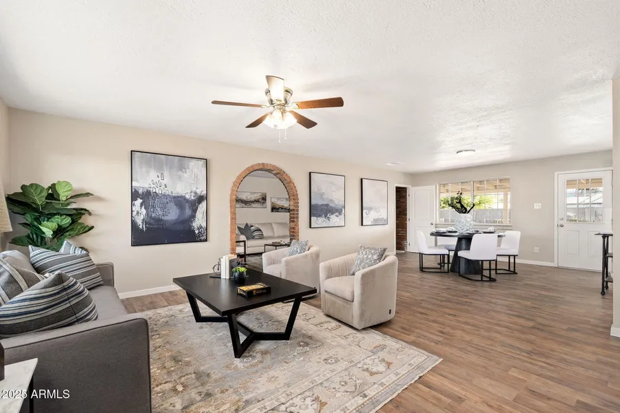 Discover this highly upgraded 3-bed, 2-bath home in Phoenix. Comfortable living space features open floor plan with luxury wood-look floors throughout. Kitchen is bright and clean with stainless steel appliances and quartz countertops. Family room with brick fireplace could be used as an office or hobbyist area. Ensuite bathroom in primary bedroom impresses with custom tile walk-in shower. Location provides easy access to Grand Canyon University, Talking Stick Resort Amphitheater and I-10 freeway. This home is move-in ready and there's NO HOA. Tour today!