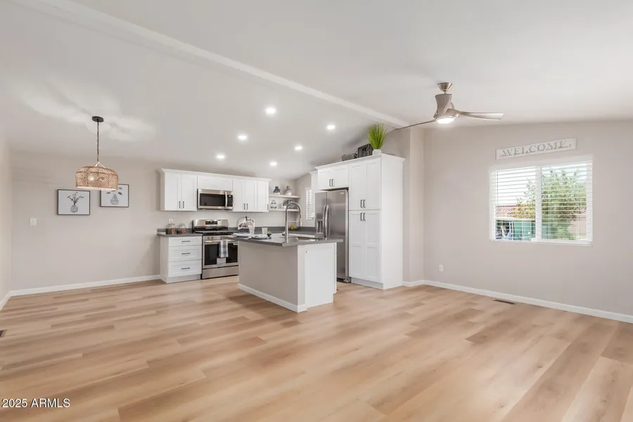 FHA ELIGIBLE w/ Engineer Cert!! NEW ROOF, NEW WINDOWS & NEW AC! Beautifully remodeled double wide on a large fenced lot. Enjoy an open, great room floorplan with vaulted ceilings, recessed lighting + NEW: Vinyl plank flooring, carpet, fans, fixtures & blinds throughout + FRESH interior & exterior paint. The stunning BRAND NEW KITCHEN includes white shaker cabinets, Quartz countertops & stainless steel appliances, including the refrigerator! Both bathrooms hav been updated with new vanities + tops. The large backyard is a blank cavas equipped with a block utility shed - ideal for storage, workshop space, or conversion potential. RV GATE/PARKING, NO HOA + EASY FREEWAY ACCESS!