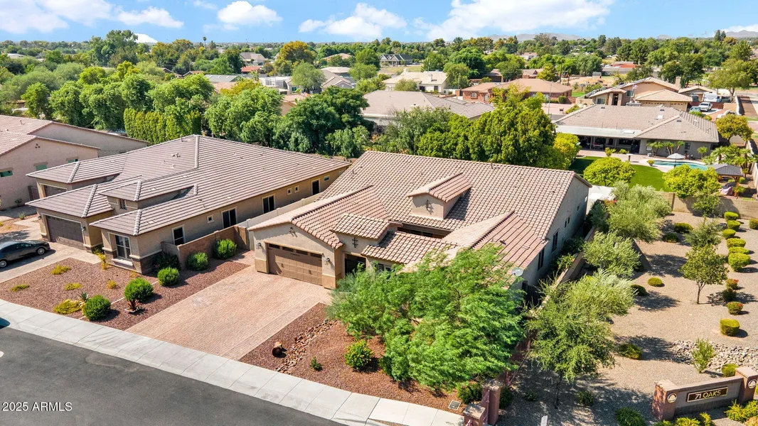 Happy Holidays! Discover a blend of flexibility and tranquility in this 2020 Peoria home, located in the gated 71 Oaks community of just 30 residences. Designed with ease of movement in mind, the single-level layout flows seamlessly for multigenerational living or frequent guests. The floor plan offers a primary suite, ensuite 2nd bedroom, two-room suite with bath, and a versatile bonus room. With a simple modification, you can create a true 4th bedroom, complete with its own bath. Neutral tones and tile throughout enhance the home's effortless livability. Outdoors, the backyard embraces low-maintenance living with new synthetic turf. Permanent lighting for every holiday! A 4-car garage provides ample room for vehicles, lake toys or hobbies. Minutes from Lake Pleasant, Westgate and P83 From the gated iron entry to the paver-lined courtyard, every approach feels welcoming. Inside, a whimsical chandelier adds personality to the formal dining room, while the great room's custom media wall and expansive windows create a light-filled gathering space with seamless indoor-outdoor flow. The kitchen elevates daily living with double-stacked cabinetry, quartz countertops, a massive island with dish drawers, a five-burner gas cooktop with griddle, and direct access to a walk-in pantry. A conveniently located powder bath near the garage entry is perfect for guests and quick refreshes. Private spaces shine, from a secondary bedroom large enough for two double beds, to a two-room suite with its own bath and walk-in closet, ideal for guests, adult children, or a caregiver. The bonus room offers even more flexibility for hobbies, music, or crafts. Outdoors, mature citrus trees, a shaded arbor, and an expansive covered patio extend the living space, while the labyrinth and modern gas fireplace create a serene focal point for quiet moments or memorable gatherings.