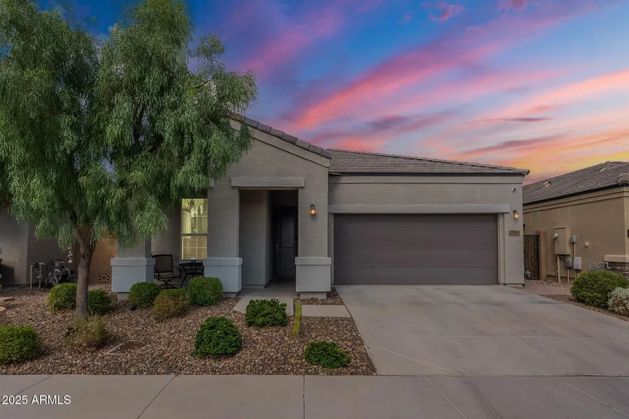 NEARLY NEW single level 4 bedroom home with a pool in this gated community. Walk to state of the art Fireside at Norterra community center! Take in the glorious sunsets in this private backyard. Spacious well-designed over 2000sf Bluebird floorplan. Beyond the front porch you'll find the den and dining room. The gorgeous gathering room is so fun for bringing guests together & opens to refreshing pool with baja step, covered patio, pergola, and firepit. Entertain in this island kitchen with white cabinets, gas stove, granite counters. Neutral wood plank tile flooring throughout. Primary Suite features walk-in designer closet , dual-sink vanity & super shower. Ideal split floorplan includes front bedroom with bath for guests, den & 2 bedrooms with bath. Epoxy garage floors Must see today Back Patio features power sunshades