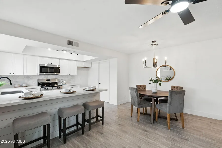 Step inside this move in ready, refreshed 3 bed, 2 bath home. It offers fresh interior & exterior paint & new wood-look tile flooring throughout the main living areas. The living room features a picture window that fills the space w/ natural light. The updated kitchen is a standout, showcasing custom shaker cabinetry, a tiled backsplash, sleek quartz countertops, stainless steel appliances & a breakfast bar for casual dining. All bedrooms feature new carpeting for a cozy feel. The primary suite includes a walk-in closet & en suite bathroom complete w/ a refinished tub/shower surround & a new vanity with quartz counter top. Outside the backyard offers a covered patio, overlooking a blank canvas, ready to be your ideal outdoor space.