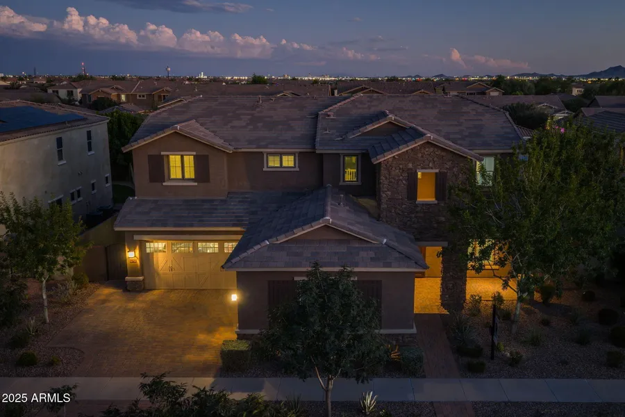 Discover this incredible 7 bedroom, 5 bathroom home designed for comfort, style, and entertaining. Inside, you'll find a spacious loft, a private movie room complete with projector and screen, and two laundry rooms, one upstairs and one downstairs, each with cabinets and sinks for maximum convenience. The gourmet kitchen is a chef's dream, featuring double ovens, soft close drawers, granite countertops, a composite granite sink, and rich espresso cabinetry with pull out shelving. The main floor offers the luxurious primary suite with a seamless shower and rainfall shower head, separate tub, and raised vanities. Also on the first level is a guest bedroom and full bath with an ADA approved walk in tub for accessibility. Upstairs, the additional bedrooms are well sized, and the thoughtful floor plan provides flexibility for guests, hobbies, or work from home space. Step outside to your private retreat: a heated pool with electric heat pump, chlorine system, baja step, and safety fencing, all complemented by a pergola and pavered patio. The garage is as impressive as the interior, offering built in cabinetry, epoxy flooring, and a 220 amp EV charger. This home blends luxury with functionality, delivering space for everyday living and memorable gatherings. Living in Eastmark in Mesa offers resort style amenities, lush parks, scenic trails, and vibrant gathering spaces like The Mark and the Great Park. With its mix of recreation, events, and convenient access to shopping, dining, and major freeways, Eastmark delivers a true live, work, play lifestyle.