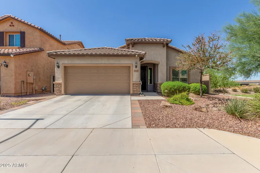 Fantastic home in Tierra Del Rio is a must-see! Sits adjacent to a common area, providing extra privacy. It offers 4 beds + den, 2 baths, manicured landscape and 2-car garage w/Epoxy floor & cabinets. The fabulous interior showcases plantation shutters, tons of natural light, two-tone paint, & neutral tile w/wood-look in bedrooms. The large living room seamlessly flows onto the impressive eat-in kitchen! SS appliances w/cooktop gas, travertine backsplash, granite counters, a pantry, recessed & pendant lights, ample wood cabinetry, and an island w/breakfast bar make up the culinary space. The main bedroom has a bay window, upgraded shower and an ensuite w/dual sinks & a walk-in closet. Outback, you have an extended paver-covered patio, fire pit, built-in BBQ, & artificial turf. Just WOW!! Near trails, Lake Pleasant Crossing Shopping & Dining, Paloma Community Park, Lake Pleasant, 15 min to TSMC, quick freeway access. Upgraded Attic Insulation 2025, New AC July 2024, Water Heater & Water Softener 2023, Garage Door Opener 2025