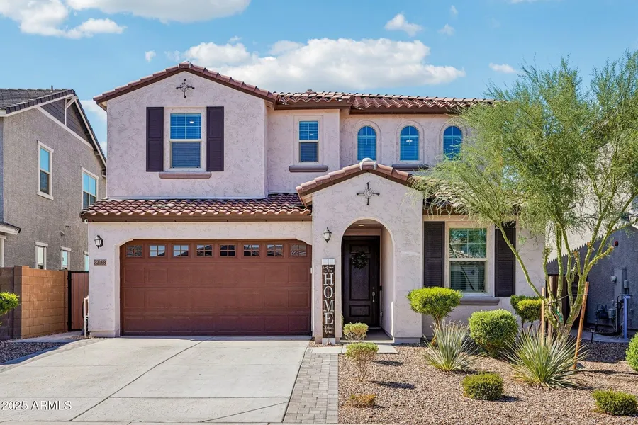 Welcome to this beautifully decorated two-story home offering 3,268 sq ft of style and functionality. The main level features an open layout with a spacious great room, huge kitchen island with quartz countertops, walk-in pantry, breakfast seating, and a cozy kitchenette area that flows seamlessly for entertaining. A formal dining room and a guest bedroom/office with adjacent bath complete the first floor. Upstairs, the open staircase leads to a generous bonus room, three guest bedrooms-including one ensuite-and a large primary retreat with dual vanities, private toilet room, and an oversized walk-in closet. The upstairs also includes a convenient laundry room for easy access. Enjoy modern finishes throughout, including wood-look tile flooring, a surround sound system, and designer touches. The 3-car tandem garage is pre-wired with a 240-volt outlet, perfect for an EV charging station. Outdoor living is a dream with synthetic grass, travertine pavers, covered patio, and breathtaking unobstructed mountain views backing to a wash. Community amenities include a heated pool, clubhouse, children's playground, and moreall just minutes from TSMC, Lake Pleasant recreation, and local conveniences.
