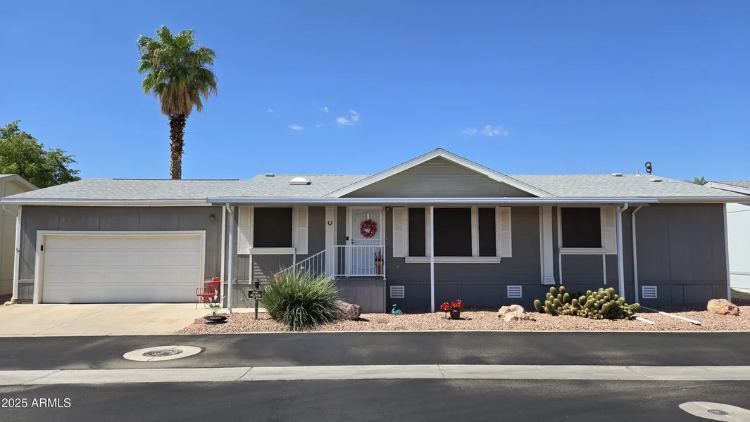 Super-wide 2BR 2BA Den Oversized Garage located in Happy Trails Resort. Don't miss this opportunity to enjoy the active adult lifestyle provided by this 55+ gated community, where the Lot is deeded to the owner. Amenities include Golf, Tennis, Pickleball, Crafts, Restaurant, R. V. parking and more. Upgrades: AZ Room (2002), Front/Backyard Irrigation (2002), Laminated Flooring (2009), Heat Pump (2013), Roof Replacement (2018), Kitchen Cabs/Counters (2023).