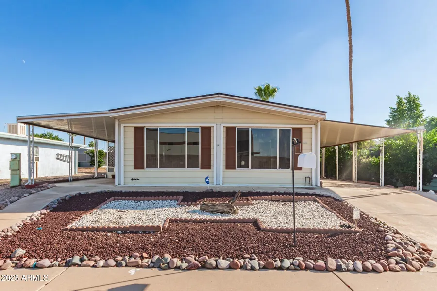 Financeable! Motivated to Sell! Don't miss this adorable 2-bedroom mobile home in Apache Wells! Get ready for cozy evenings in the spacious interior with the classic charm of wood paneling walls, wood-look flooring, vaulted ceilings with exposed beams, and plenty of natural light, making every space perfect for entertaining. The bright kitchen boasts all new kitchen appliances, ample counter space, abundant cabinetry, and built-in essentials. The main retreat hosts a closet and a private ensuite for convenience. Host fun reunions or relax in the lovely AZ room, and enjoy your morning brew under the covered patio. Discover everything this adult community offers-visit the pool, spa, workout facility, golf, and more! Welcome home!