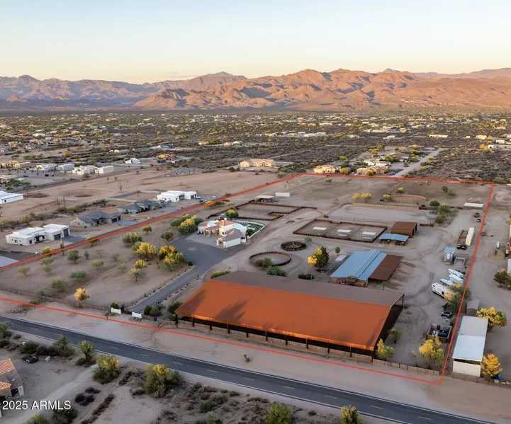 Sitting on nearly 20 acres with stunning mountain views, this equestrian estate exudes elegance and functionality. The recently remodeled main home features a timeless modern southwest design with high-end finishes throughout, 2 master suites, soaring ceilings, and abundant natural light. Expansive glass sliders open to a resort-style backyard oasis & roof deck. Overlooking exceptional equestrian facilities, perfect for a private ranch or boarding/training operation. New arena footing in both the outdoor roping (150x240) arena and covered (140x240) arena. 24-stall main barn w/2 tack rooms, casita, lounge, 4-stall mare motel, and multiple large turnouts. 2 new Alterna Container homes provide staff quarters, plus 2 RV hook-ups on this fully fenced property. Prime location, all paved roads.