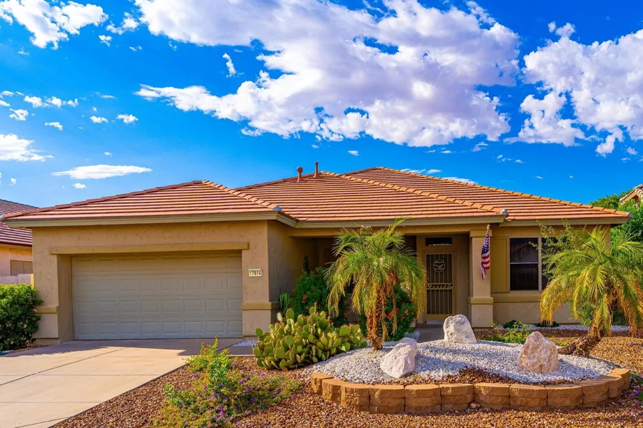 Discover a vibrant community lifestyle in this 3-bedroom, 2-bath home located within a guard-gated Golf Course Community. The residence welcomes you with a spacious front porch, perfect for relaxing outdoors. Inside, the floor plan features a formal living room, a dining room, and a large family room. A well-appointed eat-in kitchen includes a breakfast bar and a generous walk-in pantry. The comfortable primary bedroom features a walk-in shower and dual vanities. The private backyard provides a tranquil retreat with mature fruit trees and a covered patio for outdoor enjoyment. A 2.5-car garage with built-in cabinets offers ample storage space. Residents of this community enjoy a wealth of amenities, including a clubhouse, community pool, heated spa, pickleball courts, workout facility.