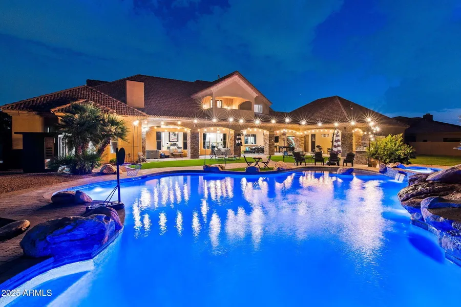 Nestled within the gated enclave of Hermosa Groves South, 3446 E. Knoll St. is a dramatic, freshly styled estate offering rare scale and sophistication. Boasting 6 beds, 7 baths across 6,703 sq ft on a lush 0.66-acre lot, this property includes a completely autonomous guest casita with its own kitchen and two-car garage, ideal for visitors, extended family, or rental income. Step into your private resort: find a pool with waterfalls, water slide, spa, sauna, fire-pit, built-in BBQ, and covered entertaining areas surrounded by mature landscaping. Inside, a refined palette of black & white finishes elevates an open, flowing layout with vaulted ceilings, custom millwork, chef's kitchen, multiple gathering rooms, and flex spaces. With 5-car garage + RV access, a premium HOA-protected setting, and proximity to top Mesa schools and North East Mesa amenities, this is an exceptional opportunity ...