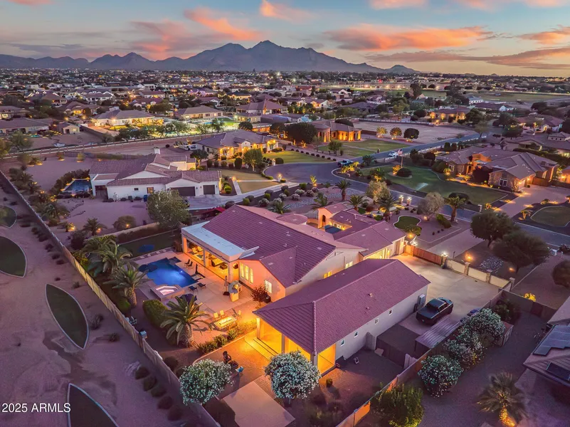 Sellers offering 1% towards closing costs, rate buydown or prepaids. You won't find a more luxurious home with this many upgrades for under $2,000,000 in all of Queen Creek!! This one-of-a-kind property stands apart from the entire Valley. Offering nearly 5,000 total square feet of sophisticated living including a main residence, separate casita, and a fully independent guest home built in 2016! This estate offers hundreds of thousands in upgrades, Including New flooring throughout ($25k), Primary bathroom Remodel (25k), Newer paint inside & out ($12k), The casita has been fully renovated, guest bathroom remodel (8k), upgraded turf in the front & back ($26k), and so much more! This home also features a 5.5 garage, 2 RV gates, and plenty of parking all situated on a sprawling 35,000 sf lot The 3,583 sf split-floorplan main home features 4 bedrooms, 3 baths, a 3-car garage, and a 344 sf casita with a private entrance is perfect for multigenerational living or guest accommodations. The 997 sf detached guest home is a sanctuary in its own right, offering a full-size kitchen, great room, large bedroom, separate laundry, and its own patio a true retreat for extended family or guests. Situated in the highly desirable community of Sonoqui Creek Ranch-County Park Estates, this estate provides a rare combination of space, luxury, and flexibility. The motor court, hidden behind a commercial-grade electronic gate, includes an RV parking pad a thoughtful addition for those with specialized vehicle storage needs. The entry invites you into the main home's sophisticated interior. To the right lies a versatile sitting room or office, while a formal dining area to the left sets the scene for elegant entertaining. The home's rich architectural details, new carpets in the bedrooms, and new ceiling fans create a refined and comfortable ambiance. The great room seamlessly transitions into the chef's kitchen a true culinary masterpiece. Here you'll find Knotty, granite countertops, a dramatic island with seating and storage, and a charming breakfast nook adorned by a reclaimed wood wall perfect for casual dining. The master suite is a restful sanctuary featuring a $25,000 Remodel includes separate vanities, a walk-in shower, a private water closet, and a huge walk-in custom "safe room" a clever blend of luxury and practicality. The opposite side of the home comprises 3 generously sized bedrooms, 2 full bathrooms, and a well-equipped laundry room with utility sink and abundant storage. Outside, a 500 sf covered patio provides a perfect view of the pool, spa, children's play area, and so much more, all surrounded by mature landscaping costing over $25,000. The separate guest home's 285 sf patio offers its own private refuge with stunning mountain views. For the car enthusiast, the extended-height, length, and fully finished garages, complete with slat wall, epoxy flooring, storage, swamp coolers, and extensive cabinetry, are a dream come true. This remarkable estate comes fully equipped with hundreds of thousands in upgrades and a range of desirable extras, including 3 refrigerators, 2 washer and dryer sets, 11 wall-mounted Smart TVs, a 12-camera security system, a charming courtyard gazebo, and a custom shed with air compressor all designed to provide a sophisticated, move-in ready lifestyle.