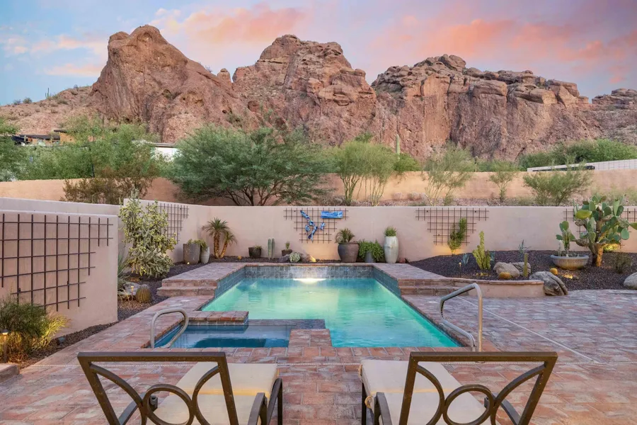 Welcome to a breathtaking retreat reimagined in 2020, showcasing casual Southwestern architecture with stunning views of Echo Canyon. This exceptional home features floor-to-ceiling windows that blend indoor and outdoor living. The masterfully crafted backyard oasis includes a heated pool and spa, a putting green, a built-in barbecue, and multiple sitting areas around a gas fireplace and fire-pit—all on one of the largest lots in Echo Canyon.