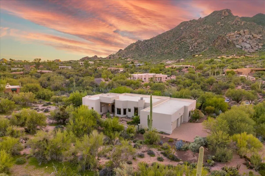 Carefree has a relaxed, upscale desert lifestyle characterized by scenic views,natural rock formations, desert vegetation, and a focus on outdoor living. Thoughtfully designed with high-end finishes custom lighting & smart home technology & 8' alder doors. This home offers a spacious split floor plan with elegant travertine floors and abundant natural light throughout. The chef's kitchen opens seamlessly to expansive living areas, creating the perfect setting for both entertaining and everyday living. Step outside to a resort-style backyard featuring a covered patio w/ misting system, infrared heaters, sparkling SW pool accented by custom water features & Travertine pavers creating a true oasis, outdoor fireplace, built-in BBQ, & lush landscaping with mature Saguaros & perfect Black Mtn View The extended 3-car garage boasts soaring ceilings with ample room to stack and showcase your most prized plete with storage cabinets and epoxied floor. A true desert retreat, this home blends sophistication, comfort, and timeless beauty in one of Carefree's most desirable settings.