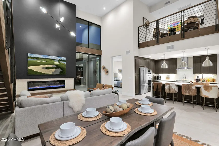Welcome to modern desert luxury in the heart of Cave Creek. Nestled within the distinctive Hidden Rock community, this Fully Furnished, professionally designed contemporary masterpiece features 4 bedrooms, each with its own walk-in closet and beautifully designed ensuite bathroom, plus a convenient downstairs powder room, well-equipped laundry room, and dual loft spaces. Spanning over 3,500 square feet, this stunning home combines sleek architectural lines with meticulous craftsmanship, timeless finishes, and breathtaking views of the Sonoran landscape. Step through the grand entry into an open-concept floor plan highlighted by soaring ceilings, expansive windows, and a seamless indoor-outdoor flow. The chef's kitchen impresses with custom cabinetry, premium stainless Bosch appliances, a luxurious quartz waterfall island, and ample pantry space. The adjoining great room features a contemporary linear fireplace, elegant dining area, and stylish wet bar with beverage fridge, perfect for entertaining or relaxed everyday living. The primary suite offers a private retreat with a spa-inspired bathroom, soaking tub, oversized walk-in shower, and a spacious custom closet. Embrace the Arizona lifestyle in your private backyard, featuring a cozy gas firepit, travertine patio prepped for a hot tub, built-in BBQ with bar height seating, and a walkway connecting the backyard to the front street for added convenience. Three of the four bedrooms, along with the loft, offer direct access to the backyard patio or upper balconies, making access easy for enjoying breathtaking sunrises and sunsets. Inside and out, thoughtful upgrades enhance comfort and efficiency, including upgraded lighting and ceiling fans, A/V prewiring, automated window coverings, tankless gas water heater, and a whole-home water filtration system. The energy-efficient design keeps utility costs impressively low! Even the spotless garage offers a touch of luxury with epoxy flooring and custom built-in cabinetry. Ideally located just minutes from Cave Creek's boutique shops, fine dining, hiking trails, world-class golf, and top rated schools, this fully furnished, turn-key home is perfect as a primary residence, vacation home, or investment property ready for immediate enjoyment.