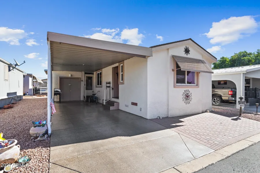 Perfect getaway for the winter months or full-time cozy home in amenity-enriched Happy Trails Resort. Newer Roof 2021. Newer AC 2021, New Water Heater + Washer/Dryer! This is an amazing single wide 2 Bed, 1.5 Bath + Sunroom and recent updates. Turn Key. Community amenities include pickle ball, tennis courts, bocce ball, fitness center, multiple pools, RV & car wash, oil change facility and social clubs.