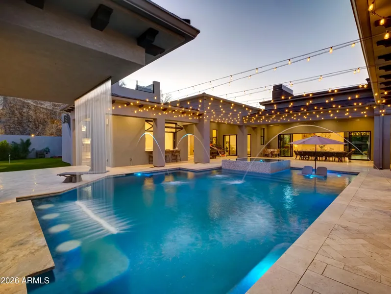 Your private resort awaits with this stunning custom ranch 5 bedroom, 5.5 bathroom luxury estate designed for entertaining and everyday comfort in the coveted Eagles Nest community. First impressions begin from the inviting gated courtyard with fireplace to the great room with soaring 20' ceilings. The chef's kitchen boasts top line 36'' Sub-zero and 36'' freezer, 48'' Wolf stove, and sub zero brand specialty Cove dishwasher. A hidden pantry with additional Cafe refrigerator and built-in microwave extend your kitchen workspace. Gather your friends and family at the expansive 15' quartzite island or enjoy serving through the 8' awning serving window to the outside bar from the wet bar equipped with beverage fridge and ice machine. Brushed champagne gold fixtures, quartzite counter and flat panel custom cream cabinets add elegance to function throughout the home. The split floor plan offers a primary suite retreat with fireplace combed limestone and elegant bathroom designed with dual vanities, lit mirrors with defrost, and custom Classy closets with secondary laundry. Find sanctuary in the free standing tub in the wet room with dual shower heads. In the opposite wing, each generously-sized secondary bedrooms boasts mountain views and its own en suite with LED backlit floating vanities. The 5th room is set up for a personal gym yet can be used as a bedroom with it's large closet, picture windows, and french doors to the backyard. Separate office or flex space with French doors to rear courtyard as well. Open the 25' living room sliders to create the seamless Arizona lifestyle as you invite the outside in. The backyard is an entertaining showpiece with a well-equipped Ramada outdoor kitchen, pristine diving pool with baja shelf and swim-up bar, putting green, and integrated patio heaters and misters added for comfort. In addition to the main living areas, guests will love the luxury attached casita with full kitchen, perfect for extended stays or multigenerational living. With 16' sliders, additional 8' awning serving window, and bedroom with en suite, your guests may be wanting to stay longer. Enjoy a 4-car garage with classy marbled garage floor coating for car enthusiasts. Capture the picturesque Four Peaks, Mazatzals, and McDowell Mountain views from either of 2 view decks as you are immersed in the beauty of the surrounding preserves and city lights in the coveted guard-gated Eagle's Nest neighborhood. It's the lifestyle you've been waiting for all on 3 hillside acres surrounded by natural desert beauty in this International Dark Sky Community. The 1-acre neighboring lot 15 is available for purchase to increase your estate. INTERIOR HIGHLIGHTS NOT TO MISS: *Porcelain tile throughout and soft white and neutral pallet of tiles *Custom Classy closets in every bedroom *Extra deep cooled 4-car garage with custom marbled epoxy flooring, custom cabinetry, and beverage refrigerator *Bonus room between primary suite and casitas, currently used as a salon studio and includes private patio. *5 heat pump systems/5 furnaces *3 tankless water heaters *Whole house water filtration system *Upgraded bidet ToTo toilets *Control 4 Smart Home system controls audio and video *2 Ring Cameras w/spotlight on driveway *Delta brand glass cleaners at all kitchen/bar sinks EXTERIOR HIGHLIGHTS INCLUDE: *Well-equipped outdoor kitchen with Blaze grill, ice maker, and prep sink *Custom outdoor blue granite bar top *2 outdoor fireplaces with large fire pit creating perfect ambiance *2 heaters and a chiller for the 10' diving pool for year-round use *2 observation decks to take advantage of watching the sun and moon rising over the mountain range *6 infrared patio ceiling heaters allow outdoor living all year long *integrated mister system *3 acre hillside lot with natural desert landscaping to preserve the community aesthetics separated from neighboring lot by a large natural wash