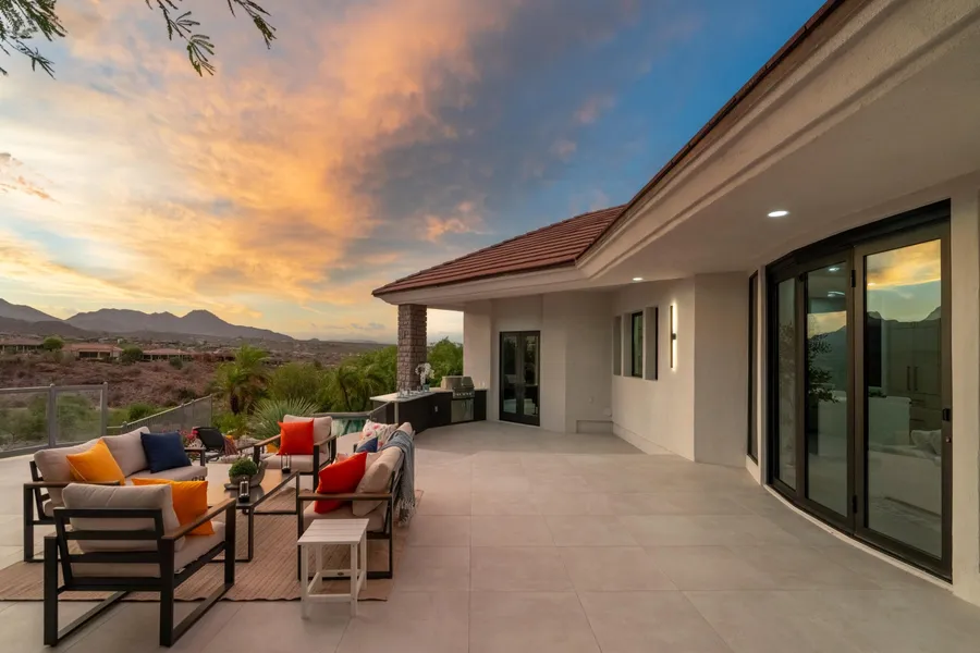 The redesigned primary suite is a true sanctuary. It boasts custom soft-close cabinetry and custom-built his-and-her closets, providing abundant storage. A luxurious free-standing spa tub, a walk-in shower with dual Kohler showerheads and a body sprayer, dual sink vanity with backlit mirrorsincluding a dedicated makeup vanityoffer the ultimate in relaxation and convenience. Every bathroom has been upgraded with all-new custom tile showers, each designed to provide a spa-like experience. In addition, all new Kohler plumbing fixtures throughout the home ensure both style and functionality in every corner of the property. Throughout the home, you'll find new custom lighting, including recessed can lighting with a night-light feature and stylish designer fixtures. The entire home is adorned with large-format porcelain tile, adding a sleek and modern touch. The custom steel-framed front entry door and foyer create a stunning first impression, while the custom-built curved multi-slide patio door opens to the expansive outdoor patio with breathtaking mountain and golf course views. One of the home's standout features is the steel glass door loungea tranquil escape designed for both relaxation and entertainment. This cozy lounge space is enhanced with custom bar cabinetry and a built-in beverage fridge, offering the perfect setting for unwinding with a drink in hand. It's a peaceful retreat that seamlessly blends sophistication with comfort, ideal for quiet evenings or social gatherings. The 3-car garage adds even more appeal to this already spectacular property. One of the garage spaces is a separate detached single-car garage, perfect for extra storage, housing a weekend sports car, or converting into a home gym or workshop. The garage also features new epoxy flooring, providing a durable and stylish surface that complements the home's luxurious upgrades. The backyard has been completely transformed into an entertainer's dream, with new patio tile, custom lighting, reimagined landscape, large sitting areas, and an infinity-edge pool that perfectly blends into the stunning golf course and mountain vistas. The built-in outdoor kitchen is ideal for hosting while enjoying the spectacular west-facing views. Additional highlights of this home include soaring 10-foot ceilings, a 3-zone HVAC system for optimal comfort, and owner-owned solar panels that provide energy efficiency. This remarkable home offers the best of sophisticated design, breathtaking views, and exceptional functionality. It's a rare gem in luxury living.
