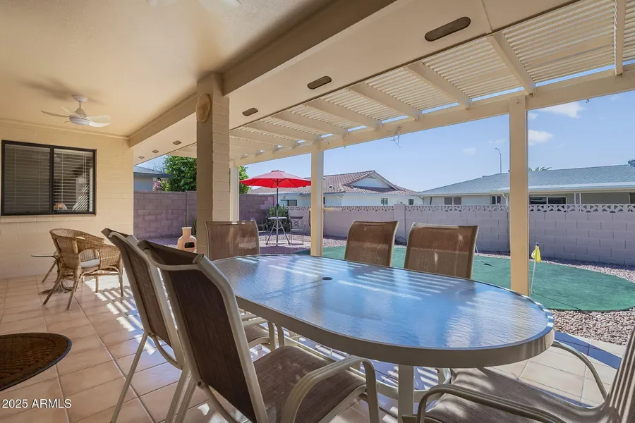 Need a little extra space? The bonus room is ready for whatever you dream up, home office, craft room, sewing studio, or hobby haven. The primary suite is a true retreat with a private bath and walk-in closet, while the spacious guest bedroom (also with a walk-in closet!) is smartly located across the home, just steps from the full guest bath. You'll love the sunny laundry roomwasher and dryer stayand there's even room for a small workstation or storage. The double garage features a handy workshop area and houses the water heater. Now let's talk about the backyard your new favorite hangout! South-facing and designed for fun, it features a covered patio, a pergola-shaded lounge area, a turf putting green to perfect your short game, and plenty of sunshine to enjoy those warm desert days.