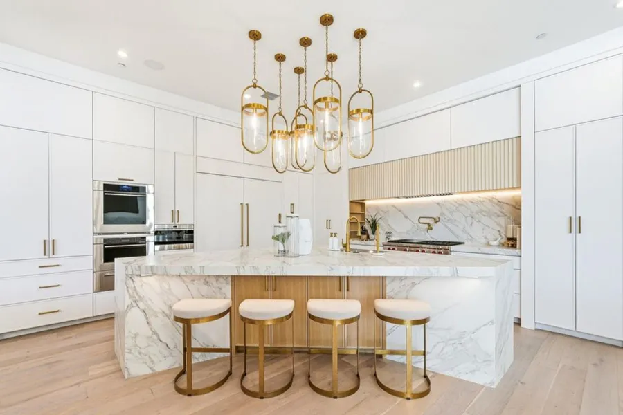 The heart of the home is the chef's kitchen, featuring custom Public House Creative cabinetry, Neolith and Caesarstone surfaces, a fluted concrete hood, and a full Wolf/Sub-Zero appliance suite with 19 individual pieces. Adjacent entertaining spaces include a beautifu...