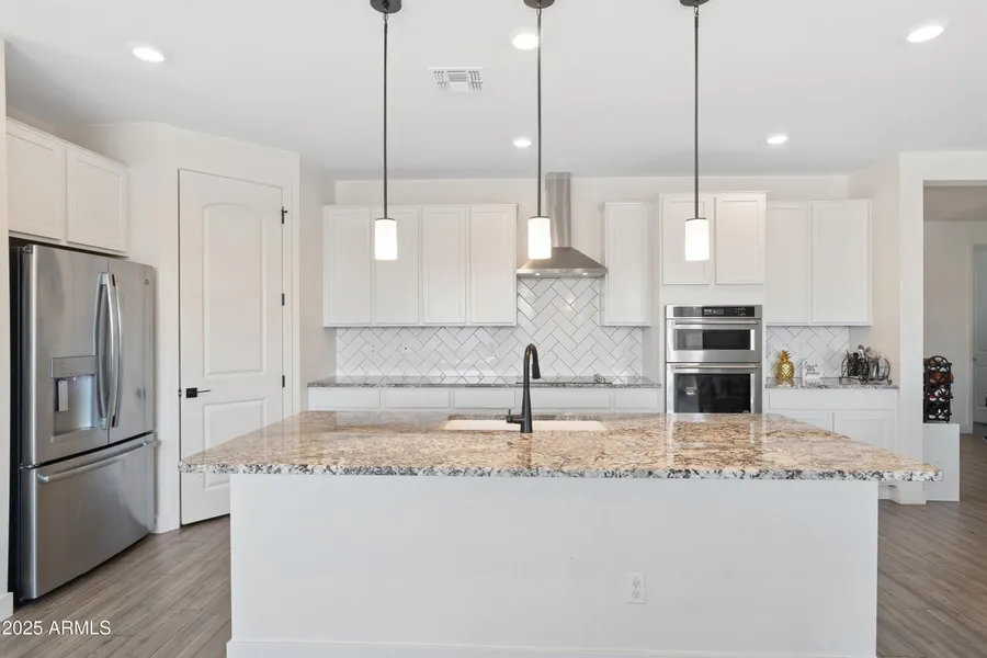 Perfect for large families or anyone needing extra space, this 3,000+ sqft two-story home offers 5 true bedrooms, a large office, and a huge loft-providing plenty of room for everyone to spread out. The main level features soaring 9-ft ceilings, an open-concept great room that flows seamlessly to the covered back patio, and a chef's kitchen with quartz countertops, a walk-in pantry, and 42-in. upper cabinets for abundant storage. A private guest suite with a full bath, powder bath, and versatile den/office with doors complete the first floor. Upstairs, the expansive loft is perfect for movie nights, a playroom, or a secondary office, while the massive primary suite boasts an oversized walk-in closet and spa-like bath with a walk-in shower and extended dual-sink vanity. Three additional bedrooms, a full guest bath, and a large laundry with sink add convenience and function. Set on a premium corner lot, this home enjoys mountain views from nearly every window and is adjacent to walking trails, a gazebo, and play areas.