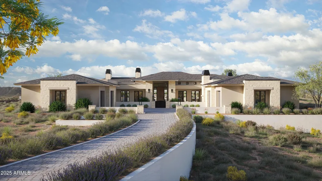 Experience this TO-BE-BUILT 5,600 sq ft custom contemporary home designed by Encore Design Group, ideally situated on a private 3-acre, no-HOA lot just moments from Tom's Thumb Trailhead in North Scottsdale's breathtaking high desert. Showcased in the architectural rendering, the exterior blends warm stone, modern rooflines, and a dramatic gated courtyard entry that sets the tone for the refined design throughout. Inside, the home is anchored by an expansive great room featuring soaring ceilings, walls of glass, and seamless indoor-outdoor connectivity overlooking the natural desert landscape. The split floor plan offers a luxurious master wing with a spa-inspired bathroom and an oversized custom closet. The secondary layout includes three private ensuite bedrooms, a dedicated guest suite, and a professional home office positioned off the front courtyard. A spacious media/game room provides the perfect retreat for entertainment or family use. At the heart of the home, the chef's kitchen features a large island, designer finishes, a walk-in pantry, and a full prep kitchen, all flowing naturally into the dining area and outdoor living spaces. A convenient pool bath supports future resort-style outdoor amenities. For car enthusiasts or those needing substantial storage, the property includes two oversized side-entry garages, offering generous space for vehicles, equipment, or workshop use. Surrounded by untouched Sonoran Desert with no HOA restrictions, this residence blends contemporary architecture, luxury finishes, and serene privacy in one of Scottsdale's most desirable natural settings.