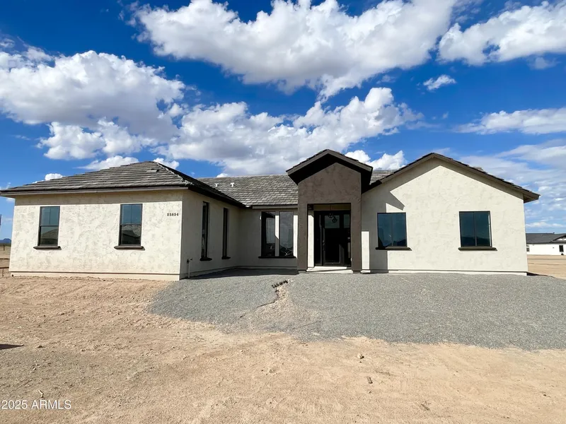 New Build! Quality and Features that will Transcend Buyer Expectations. Well designed split floor plan boasting 2,180sf 4 Bedrooms, 3 Bathrooms with 3 car garage on 1 Acre. Upon arrival you will notice the home's contemporary elevation with inviting portico, tile roofing and sweeping views. As you pass through the modern aluminum/glass entry door the high 10' ceilings, vaulted open concept great room and wood plank tile flooring will draw you in. Kitchen is a chef's delight boasting a quartz waterfall edge breakfast bar island and countertops, cabinetry with crown molding and soft-close hardware, farmhouse sink, new appliances, subway tile backsplash, under island storage, pendant lighting and 2 separate pantries. Master suite features... french doors to patio, 2 bathroom vanities/sinks, full tile shower with rain-head and glass enclosure, oversized walk-in closet, linen closet and privacy room. Guest en suite includes direct access to back patio and full bathroom with walk-in tile shower. Additional home features include laundry with sink and cabinetry, flush mount LED lighting and ceiling fans throughout, 8' tall interior door, separate dining area, extended covered patio, 8' high garage doors, added garage LED lighting, 2x6 construction, upgraded Arcadia brand aluminum lowE rated windows and exterior doors. Welcome Home!