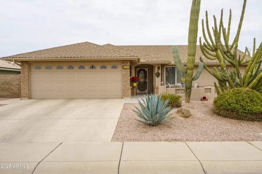 Welcoming curb appeal. You will be proud to show your friends this expanded front patio with new tile surface and soft neutral colors as you enjoy warm sunshine on this south side. Gorgeous newer tile in traffic areas just inside the ornamental oval glass entry door. Fully Furnished. Open great room plan. Enclosed back yard with big patio pavers under a pergola. Great garage cabinets. Must see.