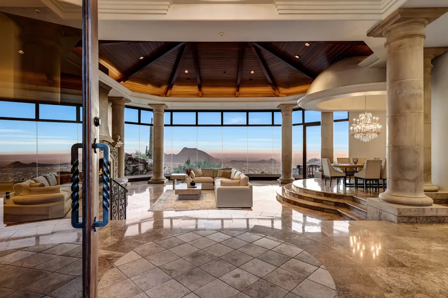 Experience unbeatable MOUNTAIN, CITY LIGHT, and SUNSET VIEWS perched high above the valley in the prestigious, double-gated Silverwing enclave of Scottsdale Mountain. This hillside estate offers 5BD w/ CASITA & 4.5BA with likely the BEST VIEW in Scottsdale. PLUS, the home sits on one of the community's highest lots, backing to protected NAOS for PERMANENT PRIVACY, making it special and unlike anything you have seen before. Every aspect of the home reflects thoughtful planning and uncompromising quality. Expansive walls of glass frame the scenery from nearly every room, while multiple patios seamlessly connect indoor and outdoor living. Each bedroom enjoys direct access to outdoor spaces, ensuring the dramatic views are always front and center. The primary suite features a Canterra stone fireplace, comfortable sitting area, private balcony, and a spa-like bath with dual vanities, generous custom closet storage, and a soaking tub positioned to overlook the canyon below. The resort-style backyard is highlighted by a heated negative-edge pool with grotto waterfall and spa, complemented by a built-in BBQ and fireplace ideal for entertaining or unwinding under Arizona's star-filled skies. The protected desert landscape below guarantees lasting seclusion, with no neighboring homes in sight. The outdoor areas also feature inviting courtyards, shaded patios, and a backyard designed to maximize comfort while capturing the surrounding vistas. The private casita is ideal for guests or multigenerational living and is thoughtfully appointed with an ensuite bathroom, wet bar, spacious walk-in closet, dedicated washer and dryer hookup, and separate entrance. One oversized secondary bedroom offers flexibility as a media room, office, or bonus space and includes a convenient wet bar. This is a rare opportunity to own a meticulously crafted and cared for estate where privacy, views, and timeless design come together in one unforgettable setting. With recent updates including brand new water heaters, updated pool pumps, exterior paint, AC units, resealed flat roof, and re-pebbled heated spa, it's ready for you to move right in! Don't forget the HOA amenities of pickleball/tennis courts, guard gate, and secondary gate. What more could you need?