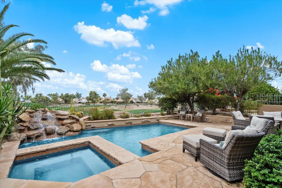 Beautiful 3-bedroom, 3-bath residence situated in the highly coveted, guard gated Gainey Ranch. Ideally positioned on the golf course, this home showcases breathtaking fairway and mountain views. Thoughtfully designed for indoor-outdoor living, this home features a private sparkling pool and spa, expansive patio for entertaining, and an interior flooded with natural light. A desirable main-level guest suite and generous living spaces create a perfect setting for both everyday comfort and hosting. Enjoy effortless access to the Estate Club just steps away, offering premier amenities including pickle ball, tennis, a full fitness center, and a resort-style pool. Enjoy elevated desert living within one of Scottsdale's most coveted locations, minutes from world-class shopping and dining.