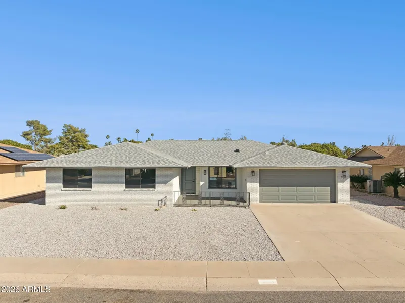 Welcome home to this beautifully remodeled, move-in-ready residence in the highly desirable Sun City active adult community. This home radiates true pride of ownership. Perfectly situated on a 8,880 sq. ft. lot directly across from the Riverview Golf Course, you'll enjoy a peaceful setting in a premier location. The property has been completely transformed inside and out. Both the front and backyard have been thoughtfully reimagined to create stunning, low-maintenance curb appeal and an outdoor oasis. Inside, the home features an open kitchen with new cabinetry, quartz countertops, and stainless steel appliances. Modern comforts include new flooring throughout, new dual-pane windows, and the removal of all popcorn ceilings. Step inside to a bright and comfortable 1,832 sq. ft. layout designed for everyday ease. The spacious primary suite boasts a large walk-in closet and an ensuite bathroom with a walk-in shower. Additionally, the home features two generous guest bedrooms with ample space for visitors, hobbies, or a home office. These rooms are served by a beautifully updated guest bathroom featuring a full tub. Open living areas create a welcoming, relaxed atmosphere, and a two-car garage provides convenient parking and additional storage. Enjoy Arizona's pleasant weather year-round from the backyard and covered back patio, or the inviting front porchperfect for morning coffee or time with friends. Ideally located just minutes from golf, recreation centers, and the shopping along Bell Road, this home offers the turnkey comfort, convenience, and community Sun City is known for.
