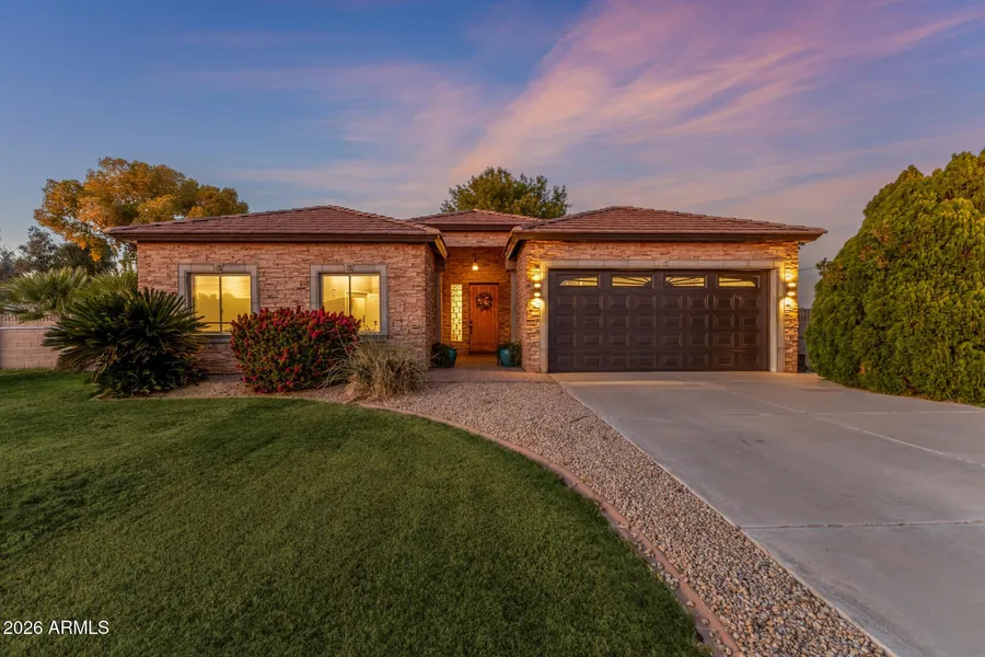 Welcome home! Experience rare South Chandler county island acre living with no HOA and all the freedom that comes with it. This stunning 4-bedroom + office home sits on a full acre and has been thoughtfully updated throughout, featuring new exterior paint, fresh carpet, plantation shutters, an oversized pass-through fireplace, newer septic and upgraded custom lighting. The air-conditioned garage adds extra flexibility for hobbies, fitness, or a private workspace. The kitchen is designed for both style and function, boasting an oversized custom pantry with a new glass farmhouse door, upgraded appliances, and large windows showcasing beautiful backyard views. A split floor plan ensures privacy for the owner's suite, which includes backyard views, a spacious walk-in closet, a relaxing soaking tub, and a custom walk-in shower. Step outside into your private oasis featuring a sparkling 14,000-gallon pool with a waterfall and Baja step, all surrounded by mature trees including a producing lemon tree and wide-open space. The property also features a dedicated horse and animal area, irrigated grounds for year-round landscaping, and ample space to accommodate RVs, trailers, or future building projects. This exceptional property delivers the perfect blend of comfort, freedom, and Arizona outdoor living, all in one of Chandler's most greatest county island neighborhoods.