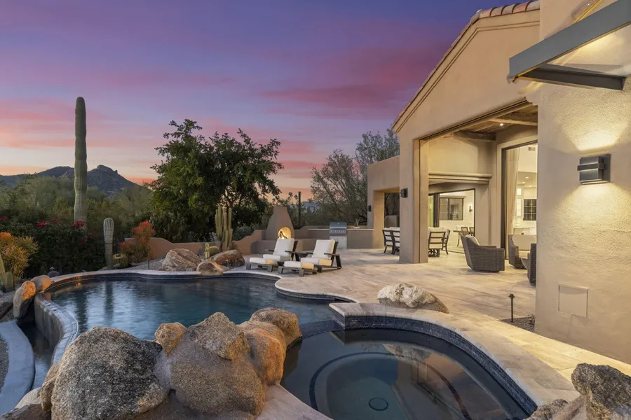 Extraordinary offering within world-renowned guard-gated Boulders Resort on exceptional lot just moments from the Club. Sunlight, water and sweeping mountain horizons define this completely reimagined 5BR/5BA zero-step desert estate with guest casita positioned where fairways, greenery, and reflective water converge. Views span Winfield and Black Mountains, distant Camelback and the Continentals beneath vast skies and memorable sunsets. The residence pairs refined wood and stone, reclaimed beam ceilings, handcrafted cabinetry and doors, spa-inspired baths with soaking tub and walls of glass for seamless indoor-outdoor living. An infinity-edge pool and spa, sculptural boulders, fireplaces, and a gated courtyard with private casita create a year-round resort retreat ideal for Arizona living