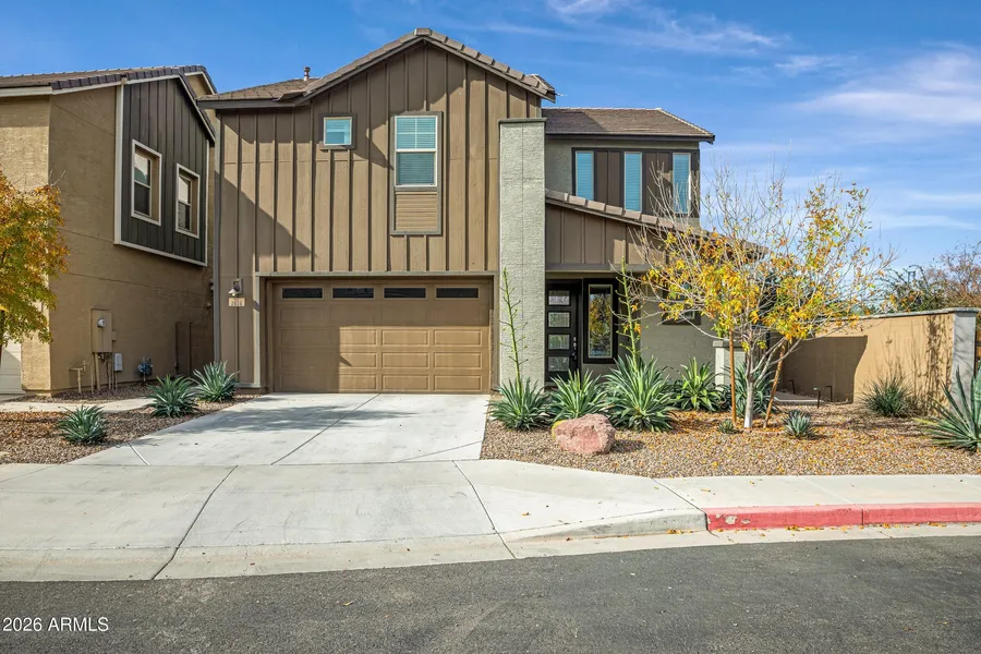 Welcome to this stunning 2-story corner-lot home featuring 3 bedrooms and 2.5 bathrooms, offering the perfect blend of modern design, space, and lifestyle convenience. Located within a gated community, this light-filled home welcomes you with a bright, airy entry and an open layout designed for today's living. The expansive Great Room effortlessly connects indoor and outdoor living with an impressive wall panning sliding glass door, perfect for entertaining or relaxing Arizona evenings. The large, modern kitchen is a true centerpiece, showcasing European style cabinetry, stainless steel appliances, an eat-in dining nook, and a spacious walk-in pantry. Upstairs, you'll love that every guest bedroom features its own walk-in closet, a rare and valuable feature. The laundry room is conveniently located on the second floor, right where you need it. The Primary Suite is generously sized, fille...