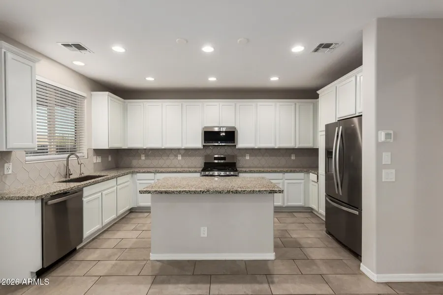 Move by Feb 1st and get 2 weeks free! Modern 5BD/3BA two-story home in the desirable Rancho Mercado community in Surprise, conveniently located near Loop 303. Open floor plan with an upgraded kitchen featuring granite countertops and stainless steel appliances. One bedroom and one bathroom are located on the first floor. Upstairs offers a primary suite with walk-in closet, double sinks, separate tub, and walk-in shower, plus additional bedrooms, bathrooms, and a laundry room. Tile flooring downstairs and carpet upstairs. Additional features include a two-car garage, ceiling fans, tankless water heater, covered patio, and mountain views. Community amenities include a dog park, multiple tot lots, ramadas, walking trails, BBQ areas, basketball courts, and a sand volleyball court. Tour today!