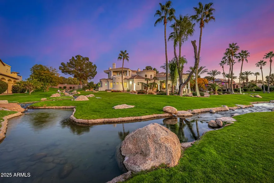 Nestled within one of Chandler's most prestigious gated enclaves, 20 E Oakwood Hills is a masterwork of Santa Barbara-inspired architecture that offers a rare combination of lakeside tranquility and palatial design. The residence makes a powerful first impression with a dramatic portico entrance and circular drive that delivers guests to your door. Step through the ornate wrought-iron front door into a breathtaking rotunda foyer and a stunning view of the living space that opens to the soothing backyard waterfall. Featuring medallion tile work and soaring ceilings that define the open floor plan, the interior is detailed with stately columns, elegant chandeliers accented with crystal teardops, rich Texas Alder and taupe travertine floors, classic granite and stone, custom iron scrolls at the foyer and informal dining cupolas, and an abundance of natural light. The primary living space ta...
