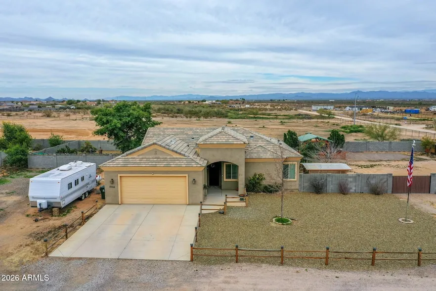 Set on a fully fenced acre beneath wide-open desert skies, this charming farm-style retreat is Zoned for horses. Wood-look tile floors flow throughout. The kitchen features stainless steel appliances, quartz countertops, and ample cabinetry, while bathrooms offer granite and quartz counters, a tiled shower, and a deep soaking tub. Every door in the home is 34'' or wider for wheelchair access. Outside, a gazebo with a crackling fireplace invites peaceful evenings. Enjoy artificial turf, RV gate with parking and plug-in, NO HOA, raised garden beds with auto-watering, a chicken coop, orchard trees (orange, pomegranate, tangelo, lemon, pecan), shade greenhouse, storage shed. Trane A/C unit & whole-house Generac generator bringing true farm-to-table living home.