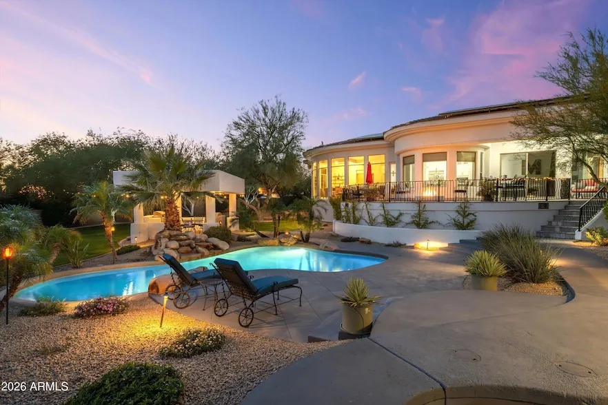 At the end of a quiet cul-de-sac in gated Cactus Gates, this modern Scottsdale retreat is more than a home it's a place to build a life across generations. With approx. 5,269 sq ft, 5 bedrooms, 6 baths, and a spacious detached guest house, the layout is designed for togetherness and independence: parents, grown kids, long-stay guests, work-from-home everyone gets breathing room. The backyard lives like a private resort: cool off in the pool, unwind in the spa, gather under the ramada, and end the night around one of two fire-pit spaces including a one-of-a-kind bench-swing fire lounge that turns ordinary evenings into ''remember when...'' stories. Energy-smart features include an owned solar system and EV charging capability. Homes like this don't just photograph well; they live well