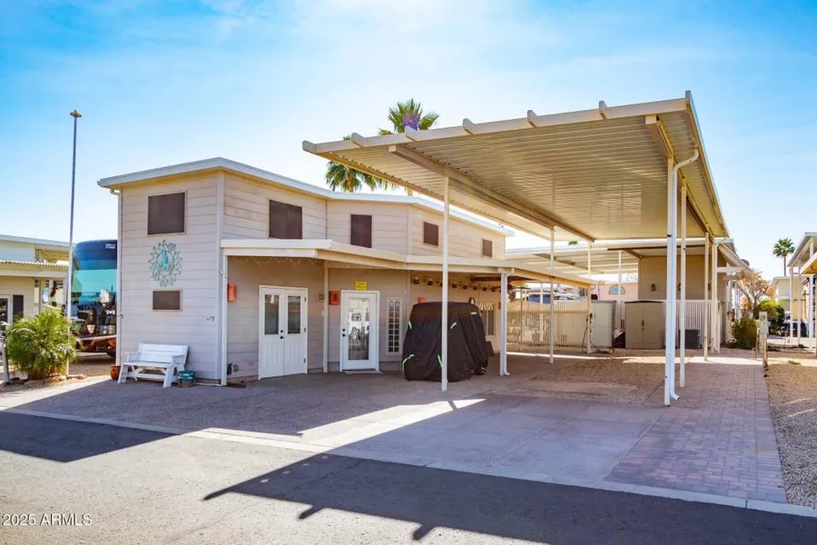 Located in the exclusive Class A Motorcoach section of The Ranch at Happy Trails Resort, this spacious north-facing casita offers approximately 500 sq. ft. of versatile living space. The lower level features a complete kitchen with a refrigerator, range/oven, microwave, and sink. This casita includes a full bath, a utility room with a washer, dryer, and double doors providing ample golf cart storage for a lock-and-leave setup. Upstairs the ceiling is 5'11'' and the open room can serve as a bedroom, hobby space, or additional living area. There is also a separate room with a door for privacy upstairs giving additional storage or office space! Enjoy the new covered RV parking with a 200 AMP panel. Golf cart included! Prime golf location & is near shopping, dining, and entertainmentChair lift at stairs provide convenient access to upstairs and downstairs. Utilities included with HOA fee's.