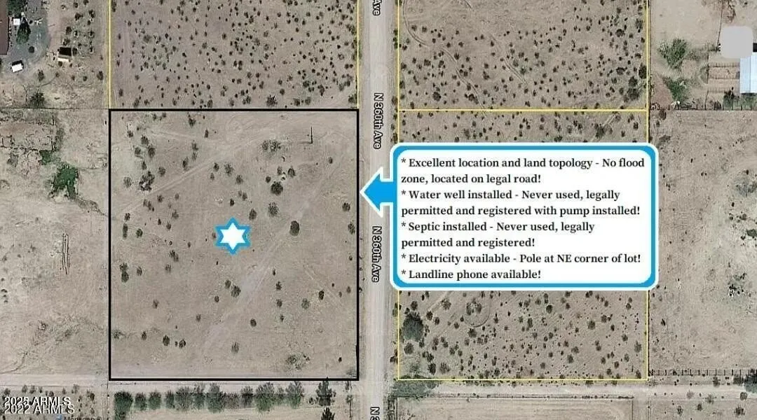Tonopah, AZ - Ready for Your Dream Home! Welcome to the stunning community of Tonopah, Arizona, where breathtaking mountain views, picturesque sunrises, and wide-open spaces await! This 2.31-acre lot is in a prime location and already has a legal street address, making it a fantastic opportunity for your next home or investment. Key Features: Permitted & Registered Septic - Never used, ready for your plans! Permitted & Registered Well - Can be powered by 120VAC, 240 split-phase, or direct solar for off-grid options. Power Access - An APS power pole is conveniently located at the corner of the lot. Equestrian-Friendly - Plenty of room for horses and animals. Outdoor Adventure - Bring your ATVs and enjoy easy access to miles of open desert trails! This ready-to-build lot of
