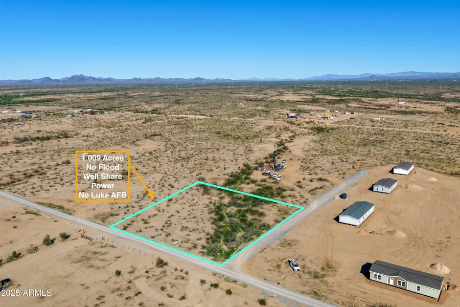 This build ready, 1.009 acre, property includes 1 share of a brand new productive well installed with 620 ft of PVC. Terrain is flat with minimal wash issues. Power is within 300 ft, and roads provide good access. No flood issues and no Luke Air Force Base restrictions. Owner is motivated. (Parcel 5C per attached survey)