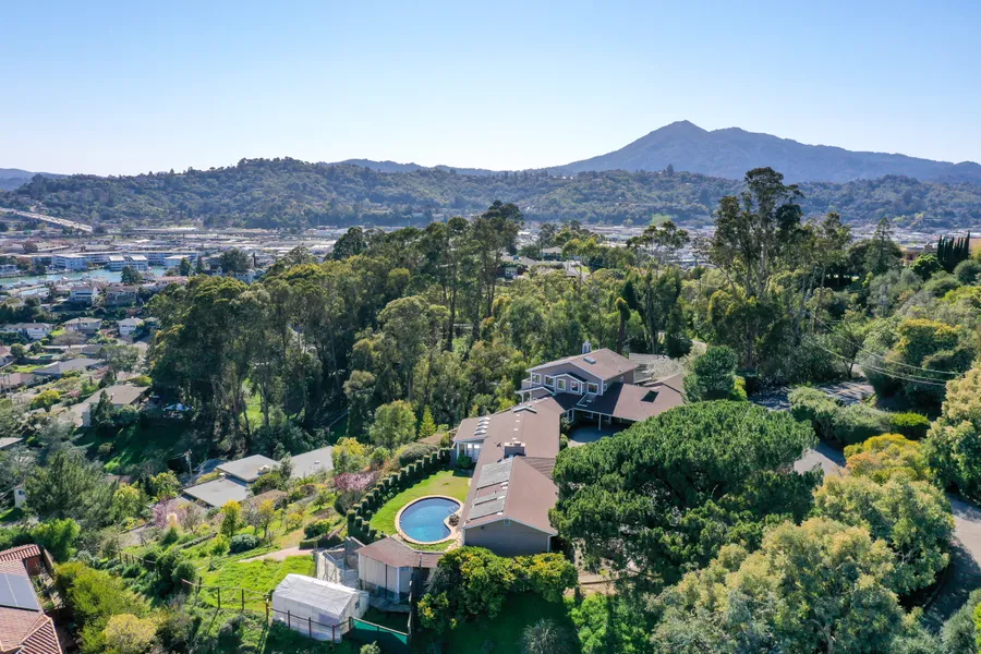 This premier south facing property has views from Mount Diablo, over the bay, two bridges, and Mount Tam. Sitting on over an acre, it has great privacy, a pool, and unmatched huge terraced garden area over the lower lot. The primary bedroom wing has access to the yard and pool. The living room has high ceilings, fireplace, and large windows highlighting the views. The adjacent island kitchen has built-in double ovens and gas cooktop in the island. The full dining area is just outside the kitchen, leading to a large sunroom. The large family room has high ceilings, wood floors, huge fireplace, full wet bar, and 2 bedroom, 1 bath on the second level. The back of the attached 2-car garage leads to the separate 1 bedroom/1 bath apartment/in-law unit. The separate office/bath is next to the built-in outdoor kitchen. The massive terraced garden has mature landscaping, and two viewing arbors for quiet times. This home has incredible potential to live in as is, or truly make it an estate for life! Don't miss it!