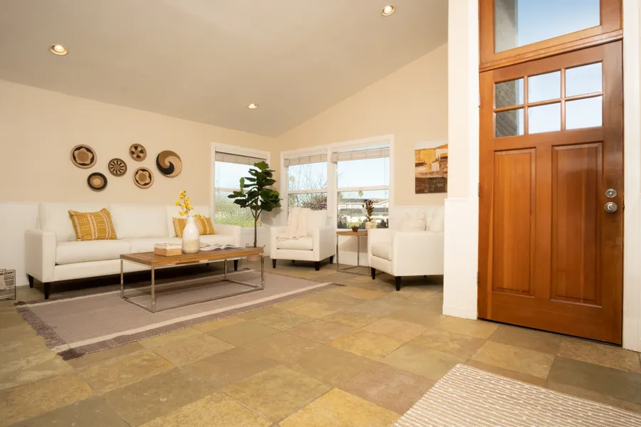 Impressive waterfront house with boat dock located in Bel Marin Keys. This single level house has vaulted ceilings in the living room and primary bedroom with stone tile floors throughout. The kitchen and family room combo has access to the large back deck that is great for entertaining. The large yard has a lawn, vegetable planter boxes, fruit trees and a hot tub. Through the gate, one has access to the quiet lagoon and boat dock. From the dock, one can paddle board, kayak or launch their boat from the covered lift. The back of the house faces south with all day sun and minimal wind. The kitchen has stone tile countertops, gas range stove, dishwasher, skylight and from the kitchen sink, a beautiful view of the yard, lagoon and hills. The primary bedroom suite has a large walk-in closet, large bathroom with stone shower and access to the back deck and yard. The 2 bedrooms have wood floor...