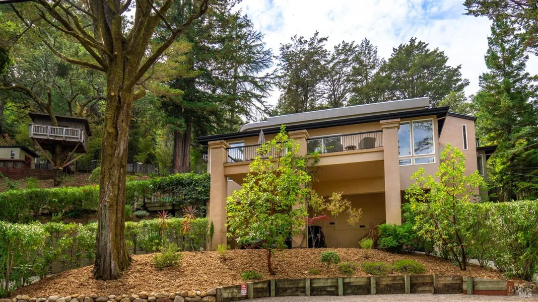Experience privacy and views from the vantage point of this exquisite contemporary home. The entry opens to a light-filled living/dining area that extends to a sunny deck for easy entertaining. The open concept kitchen has been recently updated. The main floor also offers a guest bedroom, full bath, laundry room and an expansive primary suite. The upper level has two spacious bedrooms on either side of a full bath. The interior has been freshly painted. This smart home allows wireless management of security and illumination, enhancing both your peace of mind and the atmosphere of the home. The circular driveway offers covered parking and accommodates two additional off-street parking spaces. There is ample storage below the home. The steps to the front door continue through the meticulously landscaped grounds where you'll find a charming tree house, versatile shed and a secluded hot tub offering a haven for relaxation. Outdoor enthusiasts will love the proximity to the Meadow Club, Lagunitas, Bon Tempe and Alpine Lakes as well as a hiking trail just up the street. The luxuries of space and seclusion are combined with the convenience of being only minutes away from vibrant downtown Fairfax.